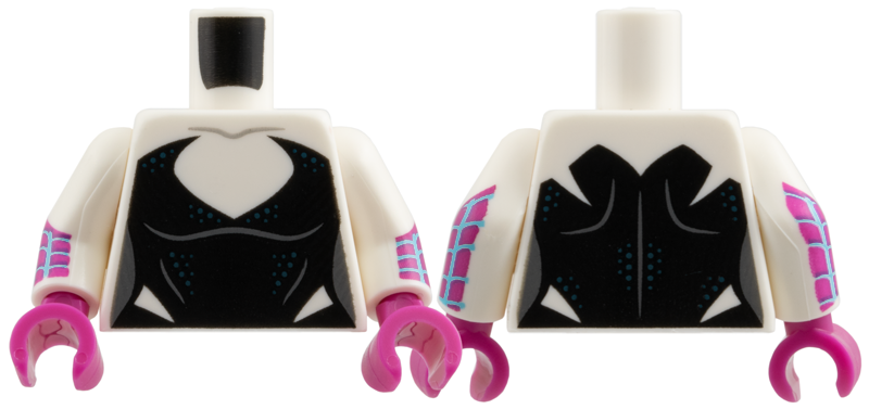 973pb6083c02 – Torso Female Black Bodysuit with Deep V Neck and Dark Blue Dots, Dark Bluish Gray Sides Pattern / White Arms with Medium Azure Webbing on Magenta Background Pattern / Magenta Hands