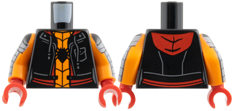 973pb6284c01 – Torso Hoodie Vest with Pocket and Drawstrings, Red Trim and Hood, Orange Shirt, Black Spider and Webbing Pattern / Orange Arms with Dark Bluish Gray Armor and Black Webbing Pattern / Red Hands